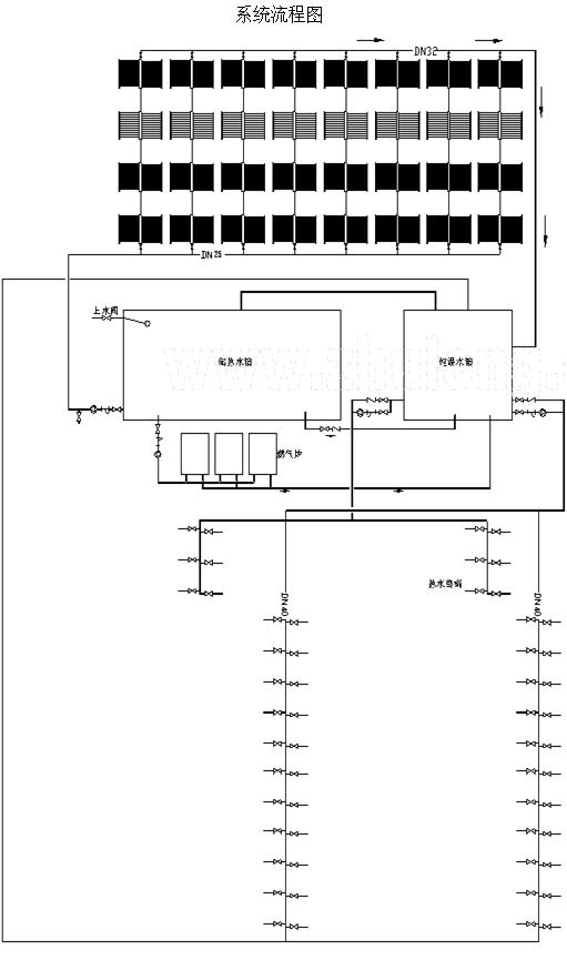2.4 系统设计流程2.4.1 本中央热水系统分为24个分系统(即一个单元为一个分系统),各分系统之间独立的。2.4.2 由于太阳能的能流密度较低(一般小于1000W/M2),相比其他能源集热速度较慢,因此需要有一个足够大的保温水箱来储存太阳能集热器在全天吸收的能量,同时为保证系统能24小时供应热水,此工程专门设计了两个水箱,一个恒温水箱,可以直接供给用户,另一个为储热水箱用于储存热量,并给恒温水箱补水,这两个水箱的容量相当于每日用水量。2.4.3 每日太阳辐射达到一定强度时,集热器开始升温并达到设定温度,这时定温感应控制器开始启动,循环水泵将冷水由储热水箱输送到集热器,冷水均匀地通过每一台集热器并被加热,加热后的热水由集热器流到恒温水箱,这样恒温水箱内的水就会被加热,多余的热水由恒温水箱流入储热水箱,如此往复的循环就完成了集热器对储热水箱内部水的加热,恒温水箱的作用就是在短的时间内获得可供使用的热水,保证24小时连续供水,由于集热器的热水是由恒温水箱流向储热水箱,保证了恒温水箱的水温始终会高于储热水箱,这样便于对辅助热源的控制。2.4.4 用户卫生热水通过设在恒温水箱上的出口供应,供水管路分为两套管路,距顶楼3层以下的用户由于足够的落差,喷淋压力完全可以保证,无须增压,所以管路上设计了循环泵,当管路上温度下降时,循环泵会自动启动,来保证管网能保持设定的水温;距顶楼3层以上的用户水流落差较小,所以设计了增压泵,当管道内有一定的水流时增压泵会自动启动,用以保证必要的喷淋压力。由水泵进行强制循环来保证热水管网的压力,当恒温水箱的温度低于设定温度时(一般为50℃),恒温水箱配置的燃气炉开始启动,达到设定温度时自动停止。2.4.5 储热水箱通过给恒温水箱补水的方式完成热量的传递,当其温度高于设定温度时,由其补入恒温水箱的热水会将恒温水箱的水温维持在设定温度以上,燃气炉不会启动;而当恒温水箱的温度低于设定温度时,说明储热水箱补入的水温不足,或者恒温水箱水温的自然下降了(这时储热水箱的水温肯定也会自然下降),燃气炉会快速启动并及时将恒温水箱的水加热到设定温度。